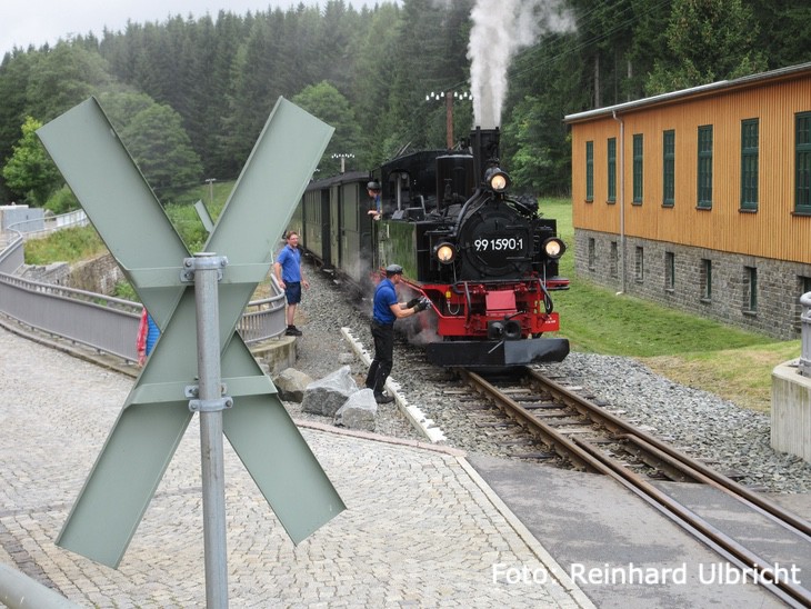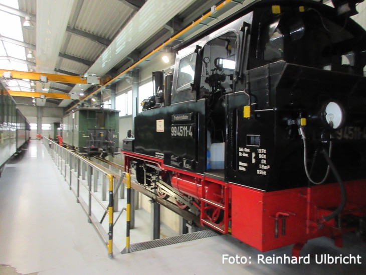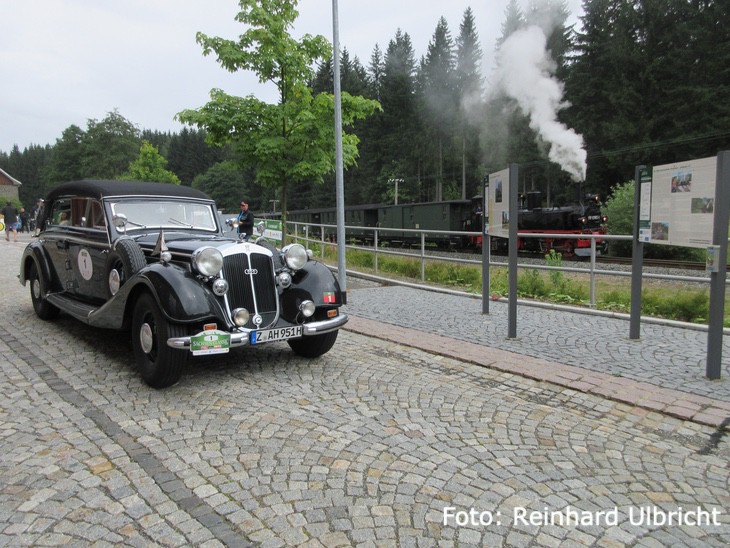 An der Fahrzeughalle stand auf dem Streckengleis ein von der Lok Nr. 99 1590 – 1 der Baureihe IV K bespannter Zug. Dem Zusammentreffen von Fahrzeugen der legendären sächsischen Konstrukteure Richard Hartmann und August Horch stand nun nichts mehr im Wege.