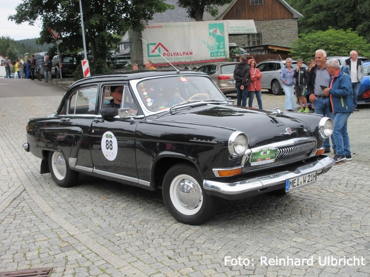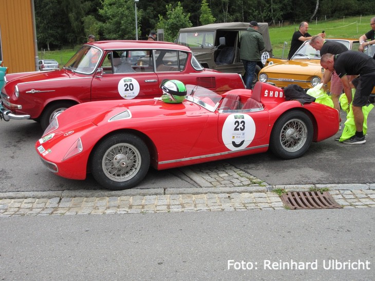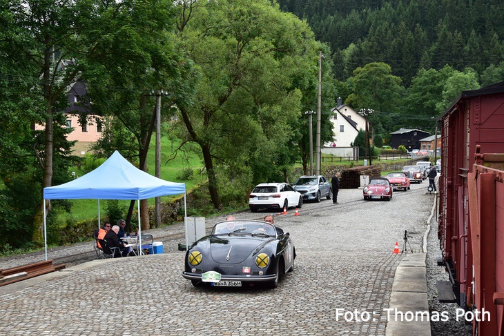Das Lokpersonal begrüßte jedoch selbstverständlich auch alle weiteren Teilnehmer der Rallye mit dem charakteristischen Pfeifen der IV K. Der Streckensprecher erläuterte Details zu den Fahrzeugen und informierte die Zuschauer über die Besatzungen. Seine Kenntnisse über die Preßnitztalbahn waren erstaunlich.